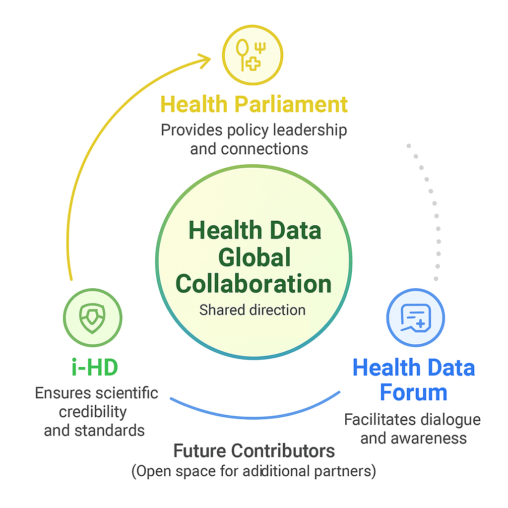 The Data First, AI Later movement is guided by a Collaborative Circle, in which three founding anchors — Health Parliament, i-HD, and Health Data Forum — bring complementary strengths. At the centre sits our Global Health Data Vision, a shared direction that evolves as new partners join the ecosystem. The circle remains open by design, inviting additional organisations to contribute expertise, perspectives, and leadership.